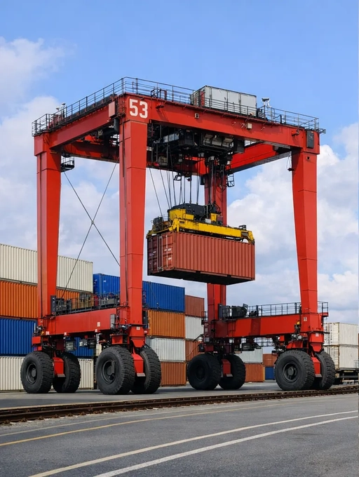 Когда ограничения по площади или доступу к грузу не позволяют строить полноценные стационарные портальные конструкции, можно использовать RTG краны высокой грузоподъемности (50–70 тонн), которые перемещаются по территории склада на колесах или рельсах.